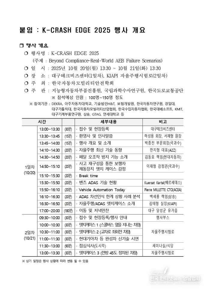 대구광역시는 10월 20일(월)부터 21일(화)까지 ‘K‑CRASH EDGE 2025’ 행사가 대구테크비즈센터와 KIAPI 대구주행시험장에서 열린다고 밝혔다.
