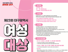 한국인터넷뉴스영남협회 김종설 기자 | 홍보물. 이미지 제공/대구광역시 대구광역시는 여성의 지위 향상과 양성평등 실현에 공헌한 여성 인재를 발굴·격려하기 위해 ‘2026년 제23회 대구광역시 여성대상’ 수상 후보자를 4월 20일(월)부터 5월 29일(금)까지 공개 모집한다. 공모 대상은 공고일(4월 13일) 기준 대구시에 3년 이상 계속해 거주하면서 ▲여성 지위 향상 및 권익증진에 공헌 ▲양성평등 촉진 및 여성의 사회참여 확대에 기여 ▲그밖에 지역사회 발전을 위해 귀감이 되는 여성이다. 신청은 구청장·군수, 기관·단체장 또는 시민 50명 이상 추천을 받아 대구시 또는 구·군 접수처에 관련 서류를 제출하면 된다. ※ 대구광역시 홈페이지(고시공고) 참조(www.daegu.go.kr) 대구시는 공모를 통해 수상 후보자를 발굴한 뒤 현장 검증과 함께 여성계·학계·사회단체 등 외부 전문가로 구성된 공적심사위원회의 심사를 거쳐 최종 수상자를 선정할 계획이다. 시상은 9월 3일 양성평등주간 기념행사에서 진행된다. 올해로 23회를 맞는 ‘대구광역시 여성대상’은 지역사회 각 분야에서 헌신과 봉사 등을 통해 여성의 권익 증진과 사회참여 확대에 기여한 인물을 선정·시상하는 대표적