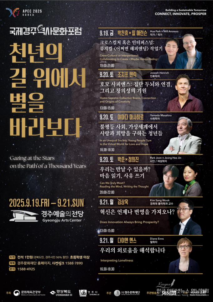 세계역사문화도시 경주의 천년 인문 정신과 세계 인문학을 연결하는 이번 포럼은 ‘천년의 길 위에서 별을 바라보다’를 주제로, 인류가 함께 모색해야 할 지속 가능한 미래에 대해 인문학적으로 접근하는 국제포럼으로, ‘APEC 2025 KOREA’ 3대 의제인 ‘연결’, ‘혁신’, ‘번영’을 바탕으로 한 6개 세션(강연)으로 구성된다.