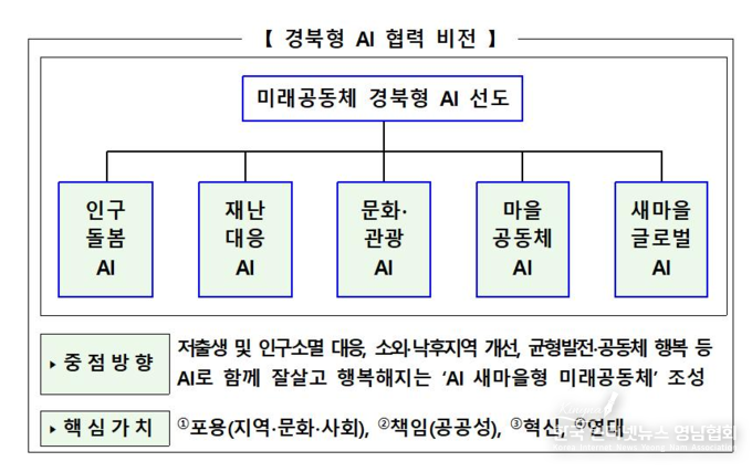 먼저 경북형 인공지능(AI) 협력 비전으로 ‘미래공동체 경북형 AI 선도’를 위한 인구돌봄 AI, 재난대응 AI, 문화․관광 AI 등 5대 분야별 대표 모델을 제시했다.