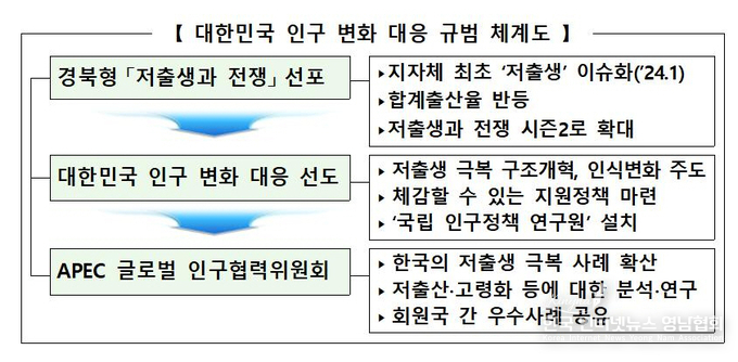 저출생·고령화 문제는 APEC 회원국 모두가 고민하고 해결해야 할 과제인 만큼 경북의 선도적 경험과 노하우가 아시아․태평양 지역 국가들에게도 큰 도움이 될 것으로 기대된다. 또한 APEC 국가들과 저출산․고령화에 대한 공동대응 및 협력을 위한 ‘국립 인구정책 연구원’의 경북 설치와 APEC산하 ‘APEC 글로벌 인구협력위원회’ 설립도 제안했다.