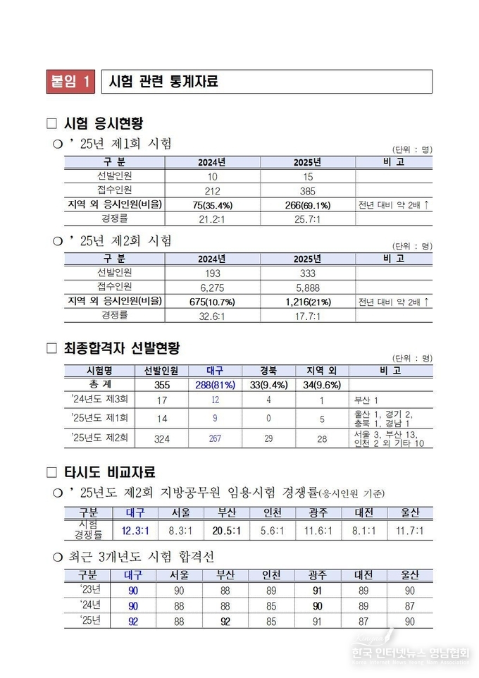 대구광역시는 지난해 폐지했던 지방공무원 임용시험의 ‘거주요건’을 2026년도 시험부터 재도입하기로 결정했다.