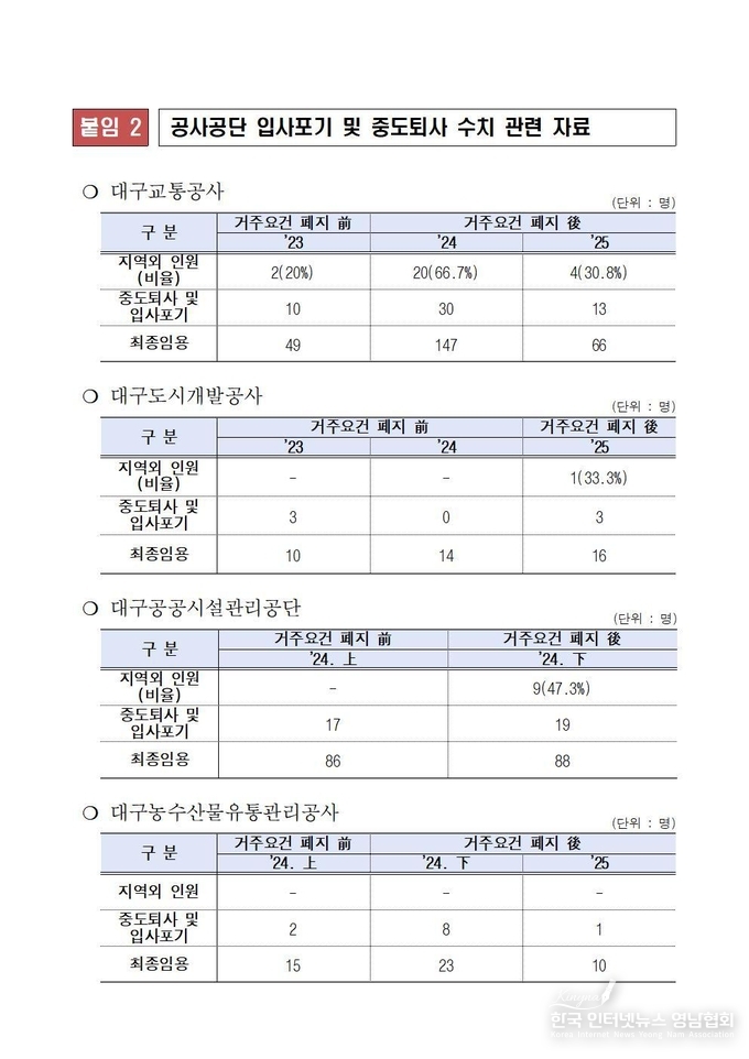 또한 고용노사민정협의회 건의에 따르면, 거주요건 폐지 이후 대구시 산하 공기업에서는 지역 외 합격자의 중도 퇴사 사례가 늘어나 업무 연속성에 차질이 빚어지고 있으며, 이로 인해 교육훈련 및 채용 비용의 불필요한 손실 문제가 심화되고 있다.
