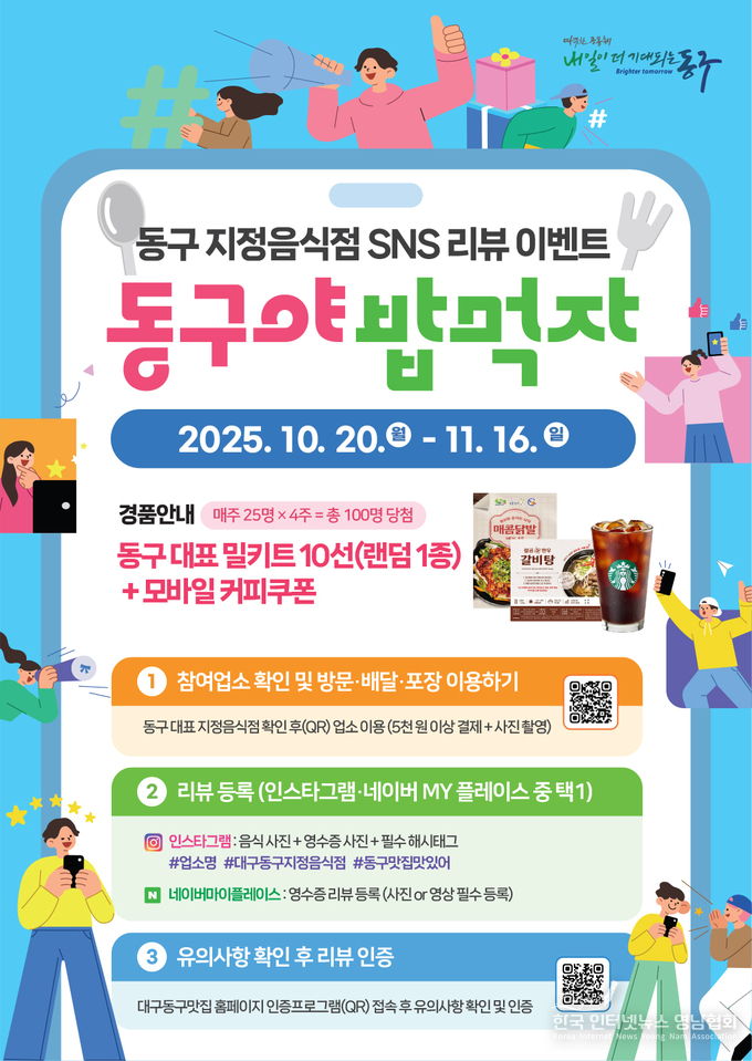 대구 동구청(구청장 윤석준)은 지정음식점 홍보와 외식산업 활성화를 위해 20일부터 11월 16일까지 4주간 ‘동구 지정음식점 홍보 SNS 인증샷 & 리뷰 이벤트’를 실시한다.