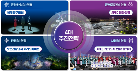 또한 ‘보문단지 대리노베이션’으로 APEC 조형물 설치, 회원국 상징 정원 조성 등 경관 및 진입도로 개선으로 대한민국을 대표하는 미래 관광단지로 탈바꿈시킬 예정이다. 뿐만 아니라 ‘APEC 연합도시 협의체’를 구성하여 개최 도시 간 문화교류와 정책 협력을 통해 경북의 도시경쟁력과 브랜드파워를 높여 나갈 것이다.