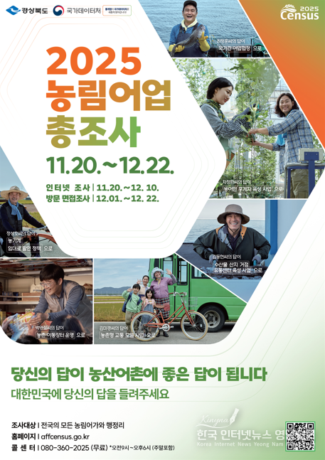 경상북도는 11월 20일부터 12월 22일까지 도내 모든 농가·임가·어가와 읍면지역의 행정리를 대상*으로 ‘2025년 농림어업총조사’를 실시한다.