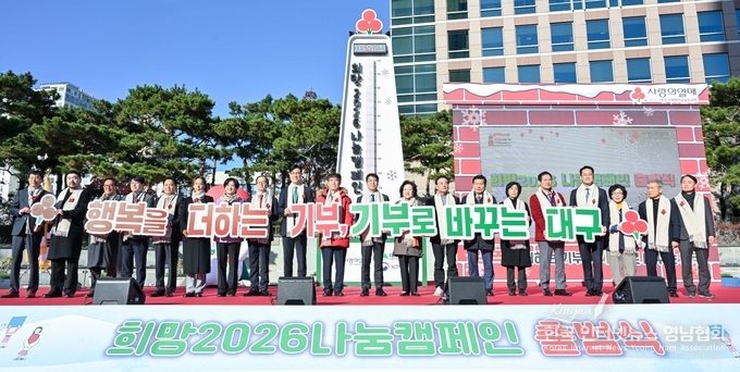 김정기 대구광역시장 권한대행 행정부시장은 12월 1일(월) 국채보상운동기념공원 내 화합의 광장에서 열린 ‘희망2026 나눔캠페인 출범식’(주최/주관: 대구사회복지공동모금회)에 참석해, 나눔실천 유공자에게 표창장을 수여하고 ‘사랑의 온도탑’을 제막했다.
