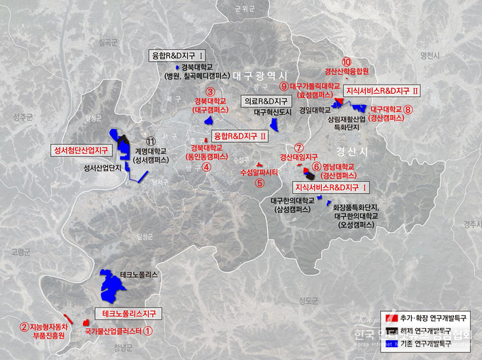 융합R&D지구에는 지역 AX(인공지능 전환) 혁신 기술 거점인 수성알파시티를 편입해 기업의 디지털 전환(DX)과 산업 융복합을 촉진하고, 대경권 유일의 연구중심병원인 경북대학교 동인캠퍼스를 추가해 의료바이오 분야 연구개발 및 기술사업화를 확대할 예정이다.