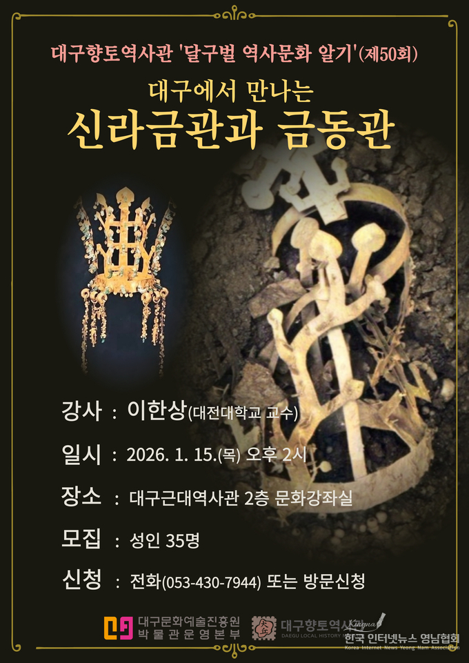 대구문화예술진흥원 박물관운영본부(본부장 신형석) 소속 대구향토역사관은 2026년을 시작하며, 1월 15일(목) 2시에 신라금관과 금동관에 대해 살펴보는 제50회 ‘달구벌 역사문화 알기’ 특강을 개최한다.