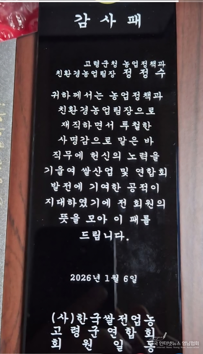 감사패에는 ‘특별한 사명감으로 직무에 헌신하며 쌀 산업 및 연합회 발전에 기여했다’는 문구가 새겨져 있다. 이는 개인에 대한 찬사가 아니라, 성실한 공직 수행이 지역 사회에 어떤 울림을 남길 수 있는지를 보여주는 상징적 장면이다.