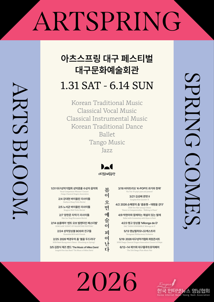 대구문화예술회관(관장 김희철)은 대구를 기반으로 활동하는 지역 예술인들의 공연을 한데 모아 그들의 예술혼을 집중 조명하는 축제 <2026 아츠스프링 대구 페스티벌>의 16개 공연을 오는 1월 31일(토)부터 6월 14일(일)까지 대구문화예술회관에서 개최한다고 밝혔다.