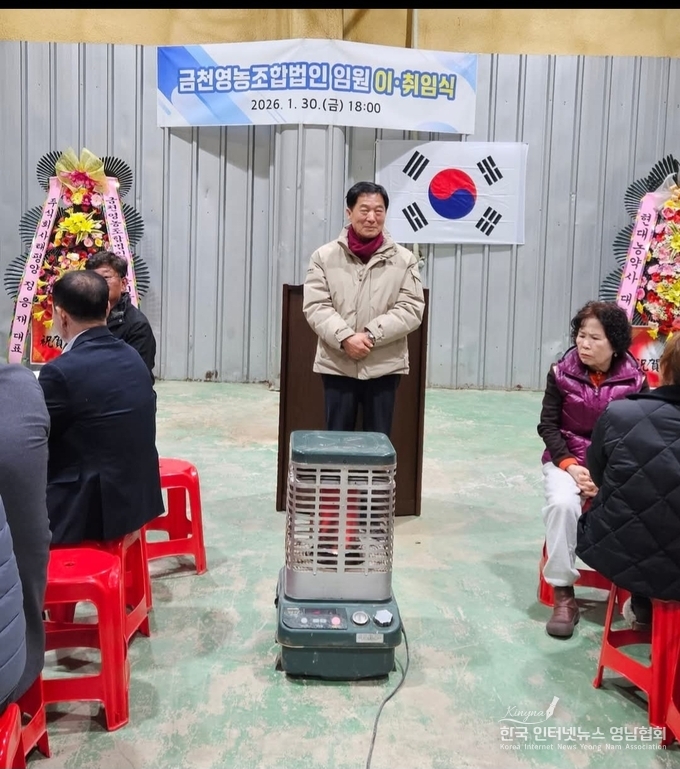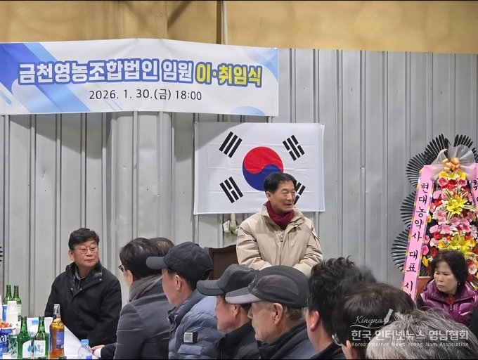 행사장에는 ‘금천영농조합법인 임원 이·취임식’ 현수막과 태극기가 정면에 걸렸고, 참석자들은 서로의 안부를 나누며 새 출발을 축하했다. 겨울 날씨 속에서도 내부에는 난방기기가 설치돼, 정갈한 좌석 배치와 함께 현장의 온기를 더했다.