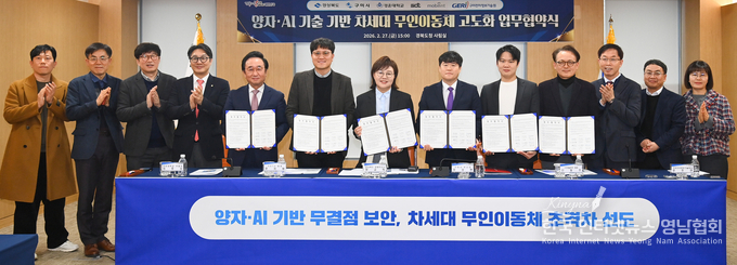 경상북도는 2월 27일 경북도청 회의실에서 양금희 경상북도 경제부지사, 정성현 구미시 부시장을 비롯해 윤지원 SDT(주) 대표, 신동주 ㈜모빌린트 대표, 최호성 경운대학교 부총장, 문추연 구미전자정보기술원 원장이 참석한 가운데 「양자·AI 기술 기반 차세대 무인이동체 고도화를 위한 업무협약(MOU)」을 체결했다고 밝혔다.
