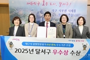 한국인터넷뉴스영남협회 김종설 기자 | 달서구, 대구시 ‘2025년 성별영향평가’ 우수상 수상 장면. 사진제공/대구 달서구 대구 달서구(구청장 이태훈)는 대구시가 주관한 ‘2025년 구·군 성별영향평가’에서 우수상을 수상했다고 19일 밝혔다. 이번 수상으로 달서구는 6년 연속 성별영향평가 우수기관으로 선정되며, 성평등 정책 추진을 위한 지속적인 노력과 성과를 인정받았다. 달서구는 조례 제·개정 과정에서 성별영향평가를 실시하고 이를 적극 반영해 왔으며, 정책사업에 대한 컨설팅과 점검을 강화해 2025년 한 해 동안 조례 35건과 사업 18건에서 개선 성과를 달성했다. 또한 ‘일상 속 양성평등 언어 사용하기’ 캠페인 등 시민들이 체감할 수 있는 생활밀착형 정책을 꾸준히 추진하며 성평등 문화 확산에도 힘쓰고 있다. 이태훈 달서구청장은 “달서구가 6년 연속 성별영향평가 우수기관으로 선정된 것은 여성친화도시 달서구의 성과이자 쾌거”라며 “앞으로도 주요 정책과 사업이 성별에 미치는 영향을 면밀히 분석하고 개선해 실질적인 성평등을 실현해 나가겠다”고 말했다.